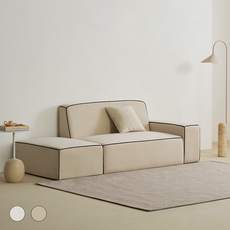 발하임퍼니처 뮤이르 아쿠아텍스 2인용 패브릭 소파는 허니버터 컬러와 좌형 구조로 아늑한 분위기를 제공하며, 스툴과 쿠션이 포함되어 실용적이고 편안한 사용이 가능하다.