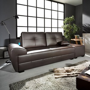초코브라운 색상의 3인용 카우치형 가죽 소파로 스툴이 포함되어 거실 공간에서 편안한 휴식과 확장된 좌석 활용이 가능하다.