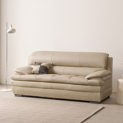 아이보리 색상의 가죽 소재 3인용 소파로 부드러운 착석감과 고급스러운 디자인을 갖춰 거실 공간을 세련되게 연출한다.