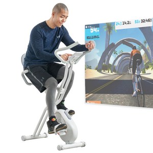 등받이형 좌석과 접이식 구조를 갖춘 실내자전거로, 즈위프트 연동 기능으로 가정에서 실감 나는 사이클링 운동을 즐길 수 있는 헬스 사이클입니다.