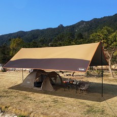 경량 옥스포드 원단으로 제작되어 휴대가 편리하며, 방수와 자외선 차단 기능을 갖춘 대형 타프로 여러 명이 사용할 수 있는 브라운 색상의 캠핑 타프입니다.