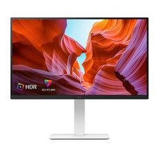27인치 UHD 4K 해상도와 HDR 지원으로 선명한 화질을 제공하며, 피벗과 높이조절 기능을 갖춘 화이트 디자인의 모니터로 다양한 작업 환경에 적합함.