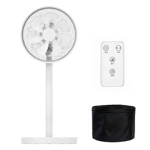 7엽 날개와 3단 풍속 조절이 가능한 접이식 스탠드형 선풍기로, 리모컨과 전용 가방이 포함되어 휴대와 보관이 편리한 제품이다.