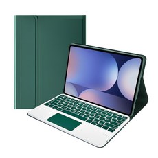 갤럭시탭 전기종과 호환되며 터치 트랙패드와 키보드 기능을 갖춘 케이스로, 펜슬 수납이 가능하고 다크그린 색상으로 세련된 디자인을 가진 제품입니다.