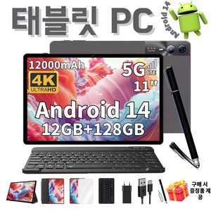 11인치 태블릿 PC 안드로이드14 12GB RAM 128GB SSD 4K(3840*2160) 12000mAh 전후면카메라(8MP+16MP) Wi-Fi 사무/교육/게임/미디어감상, Wi-Fi + 셀룰러, 회색