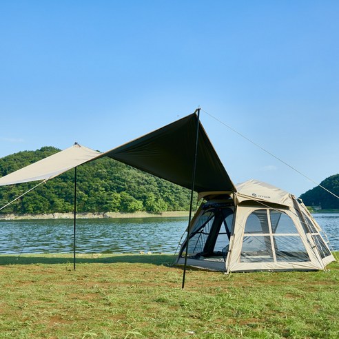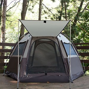 빠르게 설치 가능한 원터치 구조로 캠핑과 야외 활동에 적합하며, 4~6인이 사용 가능한 넓은 공간과 육각형 구조로 안정성이 뛰어나고, 탈부착 가능한 타프와 그늘막 기능으로 햇빛과 비를 효과적으로 차단할 수 있는 대형 세트 텐트입니다.