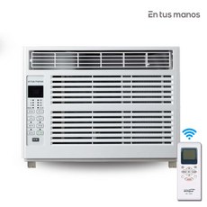 창문에 간편하게 설치 가능한 일체형 구조로 실외기 없이 사용하며, 리모컨 조작으로 편리하게 온도와 풍량을 조절할 수 있는 창문형 에어컨.