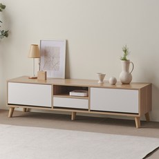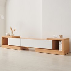 오크화이트 색상과 익스텐션 확장형 구조로 TV와 다양한 소품을 효율적으로 수납할 수 있는 서랍형 거실장입니다.