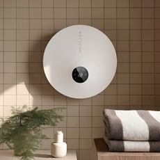PTC 발열체를 사용한 전기 욕실용 벽걸이 온풍기로, 빠른 난방과 안전성을 제공하며 샌드베이지 색상으로 욕실 인테리어와 잘 어울리는 제품입니다.