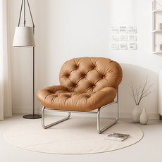 브라운 컬러 1인용 안락의자로, 부드러운 착석감과 편안한 등받이로 거실에서 휴식을 즐기기에 적합합니다.