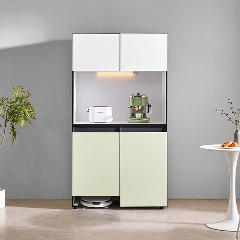 지오 비스포크 1000 광폭 주방수납장은 상부장과 하부장이 조합된 구조로 넉넉한 수납 공간을 제공하고 로봇청소기 통과형 하부와 오브제 스타일 빌트인 전자렌지대를 갖춰 주방 가전과 용품을 효율적으로 정리할 수 있는 올베이지 색상 제품입니다
