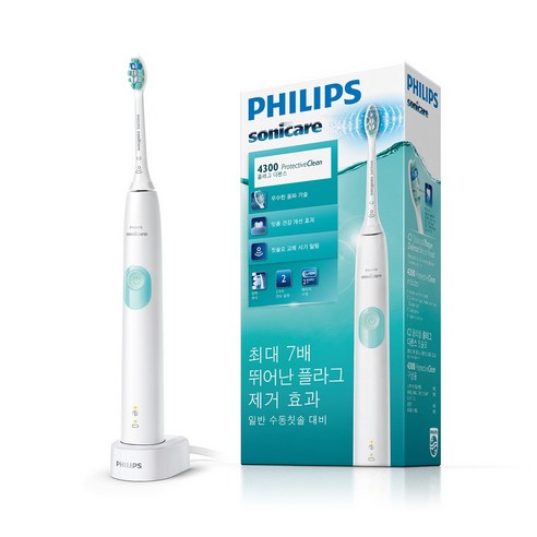 필립스 소닉케어 프로텍티브클린 4300은 고급 음파 기술로 플라그를 효과적으로 제거하면서 잇몸 건강을 돕고, 내장된 압력 센서가 과도한 힘을 줄이도록 알려주는 충전식 전동칫솔로 최대 2주 사용 가능하며 칫솔모 교체 알림 기능도 제공한다 turn0search0 turn0search12.